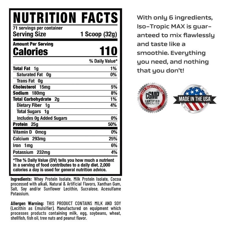 First of all no games and no amino spiking. It is just 25g of pure 100% Whey Isolate per scoop. That’s 25g of fast digesting protein to fuel your muscle growth and recovery after and intense workout. With under 120 calories per serving and 1g of sugar, not to mention delivering a smoothie like taste profile, ISO-Tropic MAX might be the cleanest and most complete protein ever made.